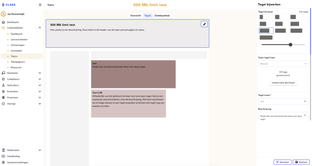 In de vernieuwde versie van de topics is het mogelijk om de indeling nog dynamischer in te richten. Je hebt nu de mogelijkheid om uit meer formaten voor de tegels te kiezen en deze vrij over de gehele pagina in te delen. Door in het ankermenu te navigeren naar ‘’tegels’’ kom je terecht op de pagina met de topic tegels. Hier kan je tegels toevoegen, verwijderen en wijzigen.