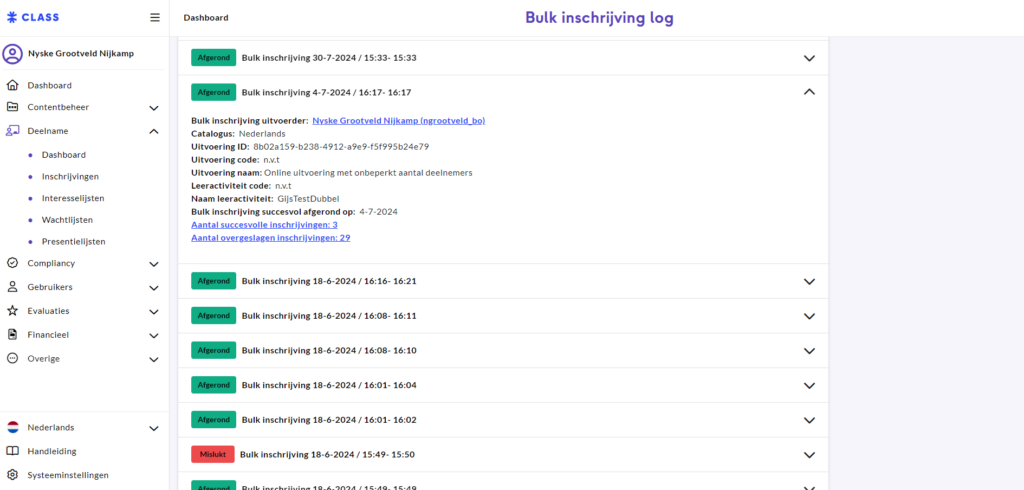 Je kunt vervolgens op de link ‘hier in de beheeromgeving‘ in de e-mail klikken om bij het bulkinschrijving log te komen. Een andere manier om bij het bulkinschrijving log te komen is via het menu Deelname -> Dashboard -> Tegel ‘Bulkinschrijving log’.